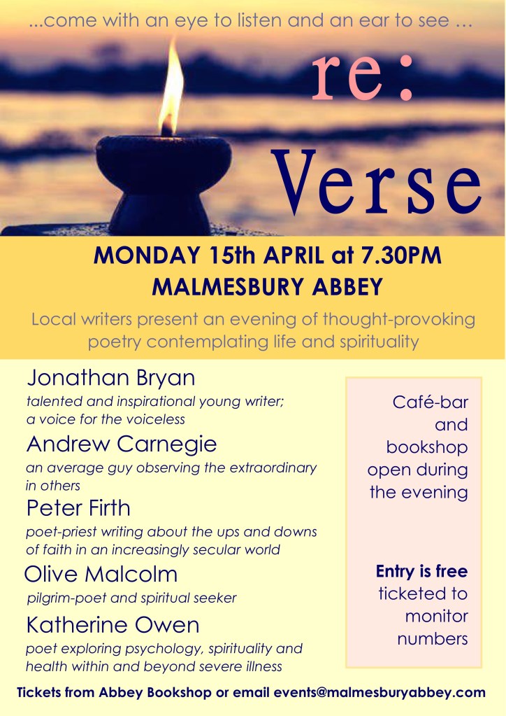 On April 15th I will be taking part in re:Verse at Malmesbury Abbey and contemplating life and spirituality with other local poets. Come and join us for this free evening (ticketed to monitor numbers and available from events@malmesburyabbey.com)