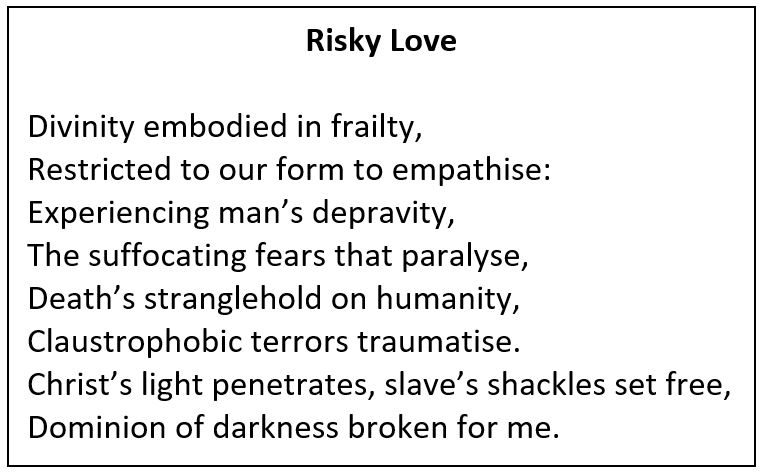 When I think of that first Christmas it is incredible to consider the risks God is prepared to take in His love for us. As the author of life itself God knew that the only way to save the story of the humans he had created was to write in the character of his own son, and send him into the world as one of us, in order that through his death the enemy, the devil, would be defeated.   As a disabled person I know what it’s like to inhabit a body that doesn’t function at full capacity; how much more amazing it is to think of Jesus, God himself, becoming restricted from being divine to being a man and sharing our humanity. There is immense power in the humility.